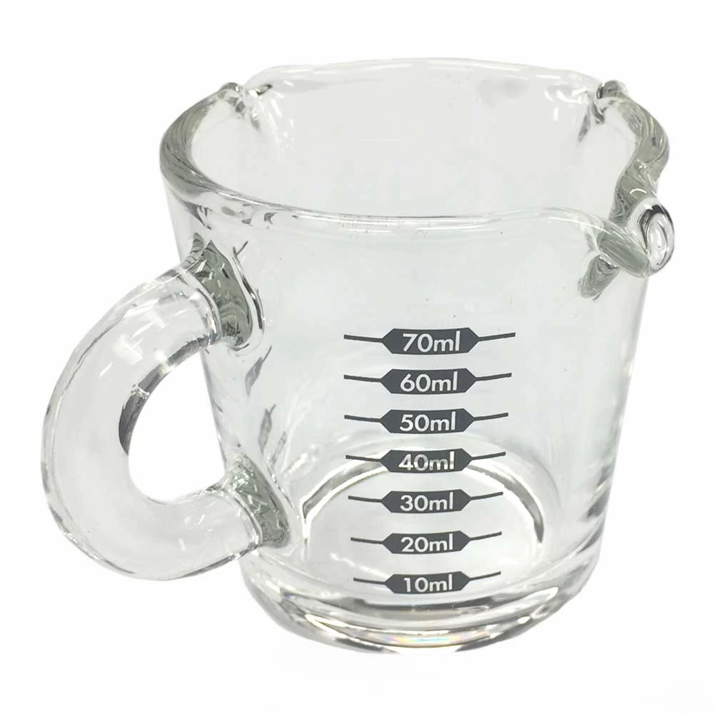 Ideal for measuring and pouring shots of espresso, this 3 spout shot glass can comfortably hold up to 2 oz of liquid and features measurements in both oz and ml. The mouth of the glass is wider than most shot glasses, making it easier to use in conjunction with standard double spout portafilters.