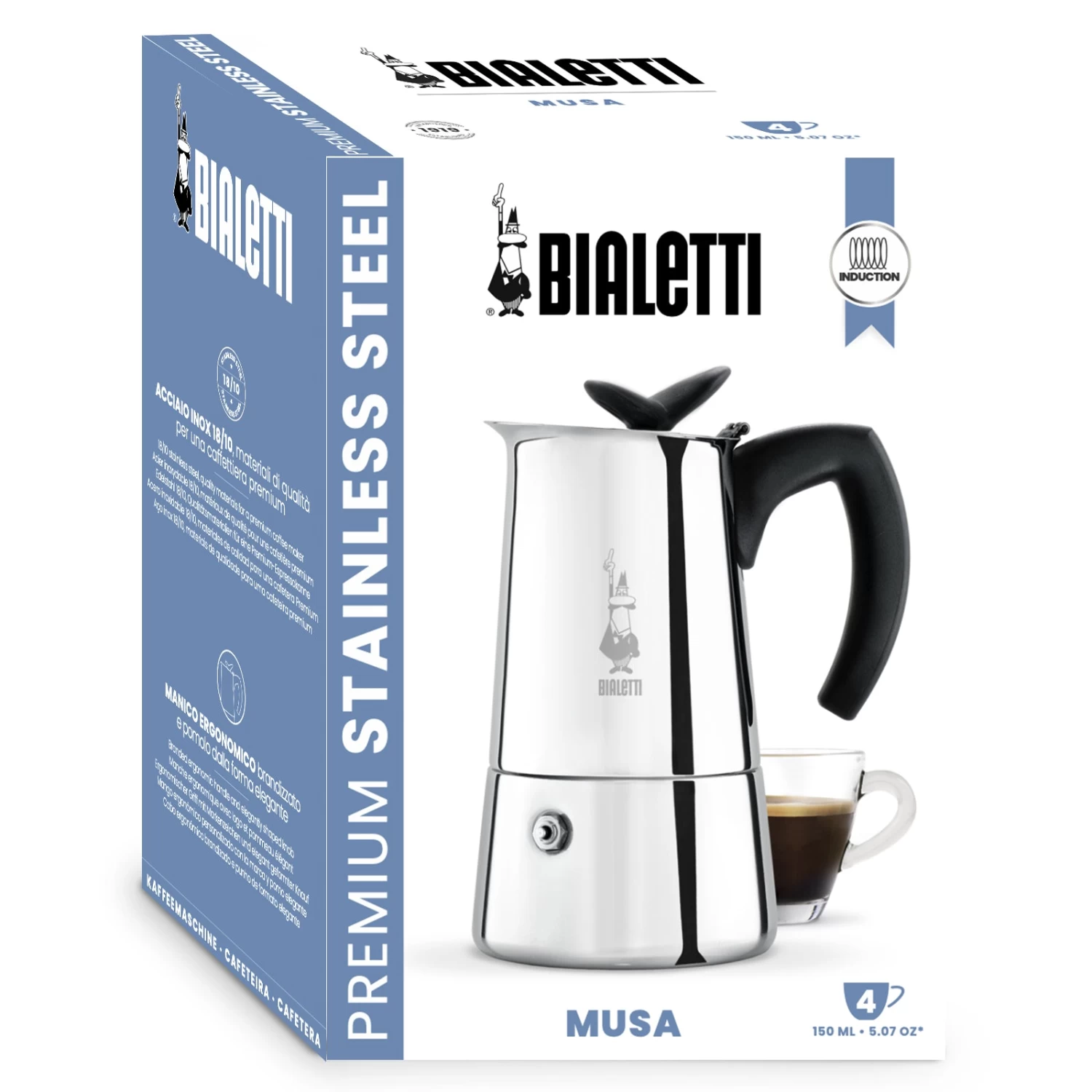 The Bialetti Musa Stovetop Coffee Maker is as stylish as it is straightforward. Sleeker in appearance than Bialetti’s aluminum stovetop coffee makers, the Musa’s frame and internal components are made of brushed stainless steel, while its handle is made from black nylon. The Bialetti Musa is suitable for use on gas, electric, and ceramic ranges.