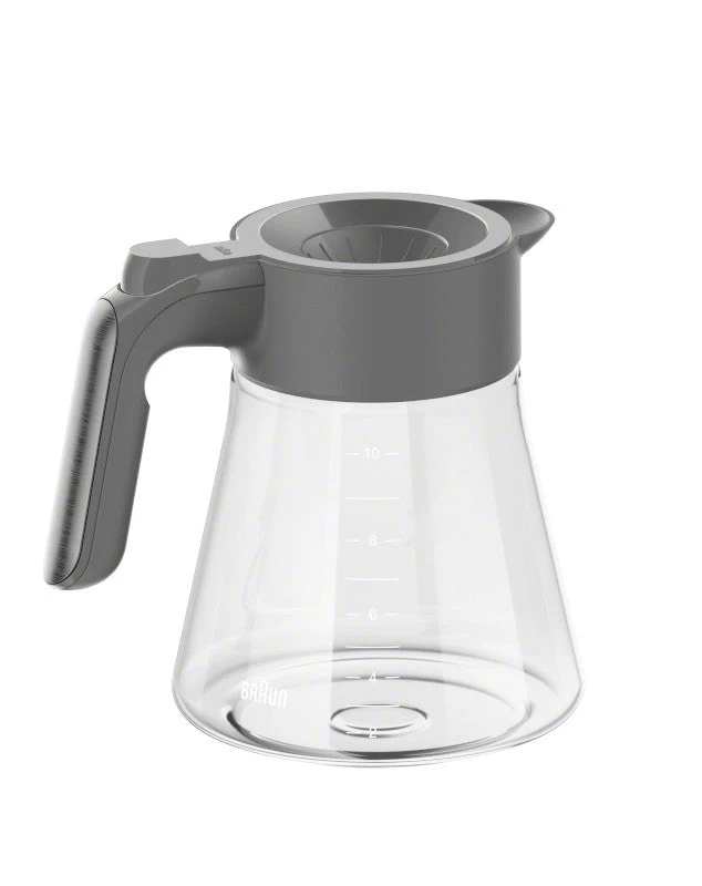 This 10-Cup Replacement Glass Carafe for the Braun MultiServe series of coffee makers is an OEM replacement part that is manufactured by Braun. Featuring a grey plastic handle, top rim and spout, this glass carafe is labeled with 2 – 10 cup markings for easy measuring when making your morning coffee.