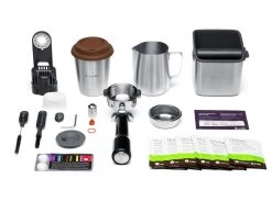 The Oracle brews and steams using two separate boilers to ensure temperature stability and steam pressure. This also means that you’ll be able to brew and steam simultaneously. As an automatic machine, the Oracle has dedicated brew buttons for both single and double shots as well as Americanos and hot water. The buttons for all three drinks can be programmed to dispense at a volume of your choosing allowing you to recreate custom drinks with just a push. Located on the front of the machine, the main LCD displays the temperature of the boiler as monitored by the Oracle’s PID controller and is accurate within 2 degrees. Using the PID, temperature can be programmed between 190°-205°F. When you begin brewing the PID transitions into a shot timer that counts up from when the brew button is engaged. The steam wand on the Oracle is truly amazing. Fitted with a powerful 4-hole tip and a temperature probe, you can program the machine to automatically texture your milk on a gradient between a latte and a cappuccino allowing you to make the drinks you want with just a flip of a switch. Alternatively, the Oracle also allows for completely manual frothing so you can hone your barista skills in the comfort of your kitchen. Located beneath the drip tray the Oracle features a drop down swivel foot that can lowered to lift the machine off of your counter making it easy to slide and rotate. Depending on your setup, excess cord can be stored in the back of the machine to keep you counter free of clutter. The Breville Oracle comes packaged with the following accessories: -Mini Knock Box -58mm Stainless Steel Portafilter -10oz Stainless Steel Double Walled Travel Mug (lid included) -16oz Stainless Steel Frothing Pitcher -Replacement Steam Tip and Gasket -Cleaning Kit -Water Hardness Test Strip -Water Filter Holder and Water Filters.