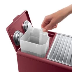 The DeLonghi ECP3220R uses a stainless steel boiler, filled by water from the tank which is conveniently hidden beneath a door on the top of the machine. You can even store your extra filter holders on the inside of the door.