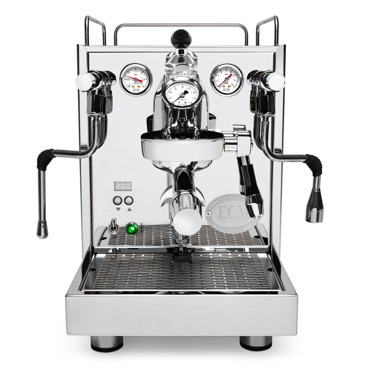 The ECM Mechanika MAX with Flow Control is a PID controlled smart heat exchanger espresso machine with a rotary pump. It introduces a number of firsts for ECM including the ability to program the PID to regulate the boiler based on the temperature at the brew group. It’s also the first with programmable weekday and weekend on/off timers so you can have the MAX ready to brew whenever you need it. Equipped with a plumbable rotary pump and <11″ wide the Mechanika MAX will have no trouble fitting into any home espresso bar.