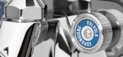 Further refinement of your espresso can be achieved through the front mounted brew pressure valve which can set the expansion valve between approximately 8.5 and 12 bar. Located opposite the gauge on the top left of the machine is the stylish brew pressure gauge which matches the knob with a cool navy blue face with white lettering.