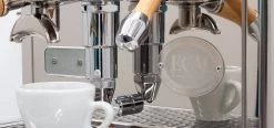The olive wood accents replace the steam and hot water taps, E61 brew lever, and the single and double spout portafilters. Compared to the stock components, the olive wood portafilters are made from stainless steel as opposed to chrome plated brass.