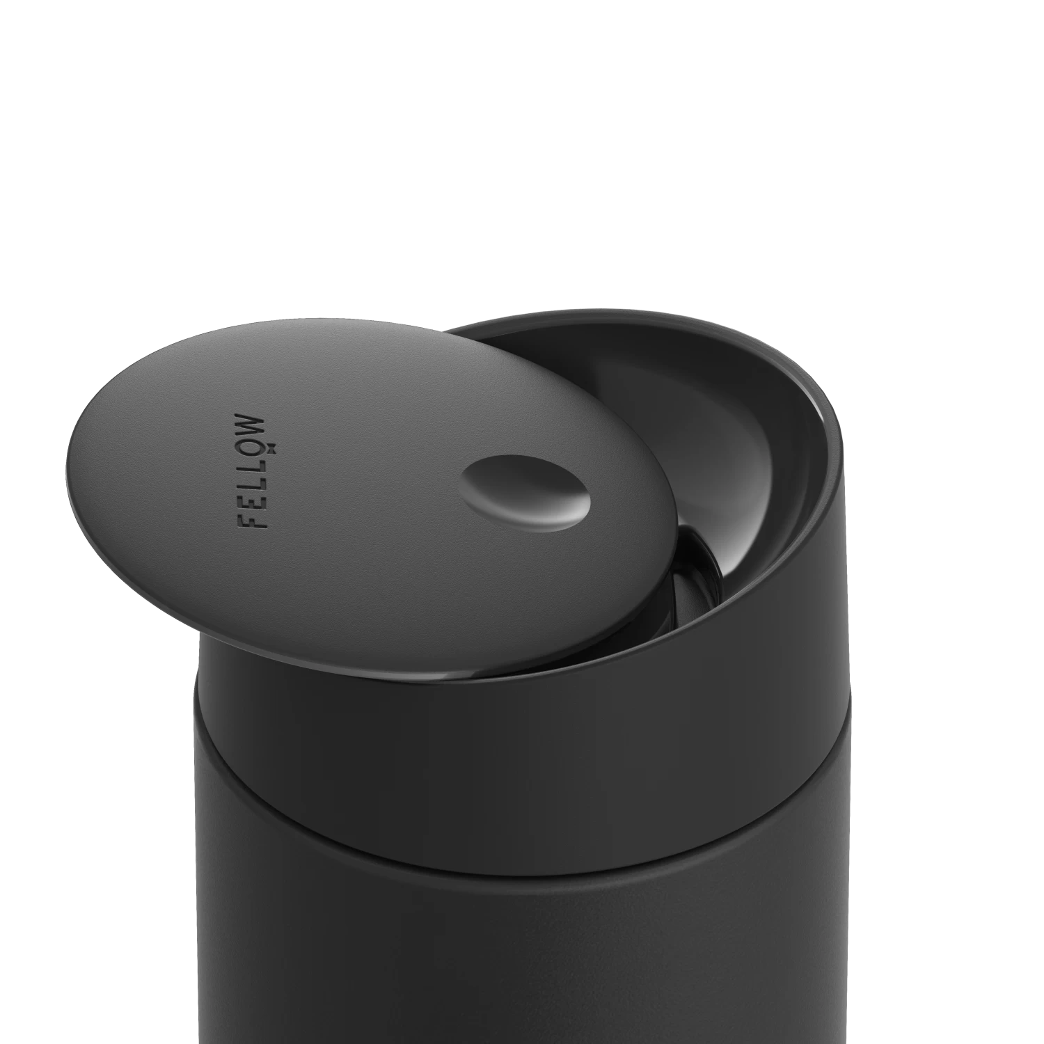 The 12oz Fellow Carter Slide Mug in matte black is an ideal travel companion for coffee lovers on the go. Its heat-lock double wall vacuum insulated stainless steel construction will keep your favorite beverages hot or cold for up to 6 hours, while the leak-proof slide-lock lid prevents spills. The lid is made of BPA-free plastic and has a big enough drinking hole for straw usage so you can sip with ease. The matte black finish gives the mug a sleek and modern look, making it the perfect accessory for any stylish coffee drinker.