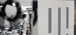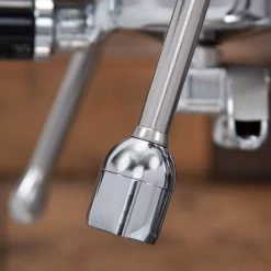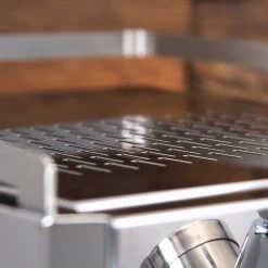 Wrapping the outside is a gorgeous, polished stainless steel housing, easily removed for work or maintenance. On top, you’ll find a large cup tray, fitted with soft foam padding to prevent rattling during operation. Rubber grips at the edges of the tray let you remove the tray comfortably and without hassle. The front of the machine is simple to read, keeping only the essential LEDs, favoring instead a single white LED above the power switch. A black double gauge presents both the steam and brew pressure for quick reference during operation. The iconic E61 group, equipped with a larger group nut, fits commercial standard 58 mm portafilters.