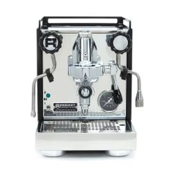 Wrapping the outside is a gorgeous, polished stainless steel housing, easily removed for work or maintenance. On top, you’ll find a large cup tray, fitted with soft foam padding to prevent rattling during operation. Rubber grips at the edges of the tray let you remove the tray comfortably and without hassle. The front of the machine is simple to read, keeping only the essential LEDs, favoring instead a single white LED above the power switch. A black double gauge presents both the steam and brew pressure for quick reference during operation. The iconic E61 group, equipped with a larger group nut, fits commercial standard 58 mm portafilters.