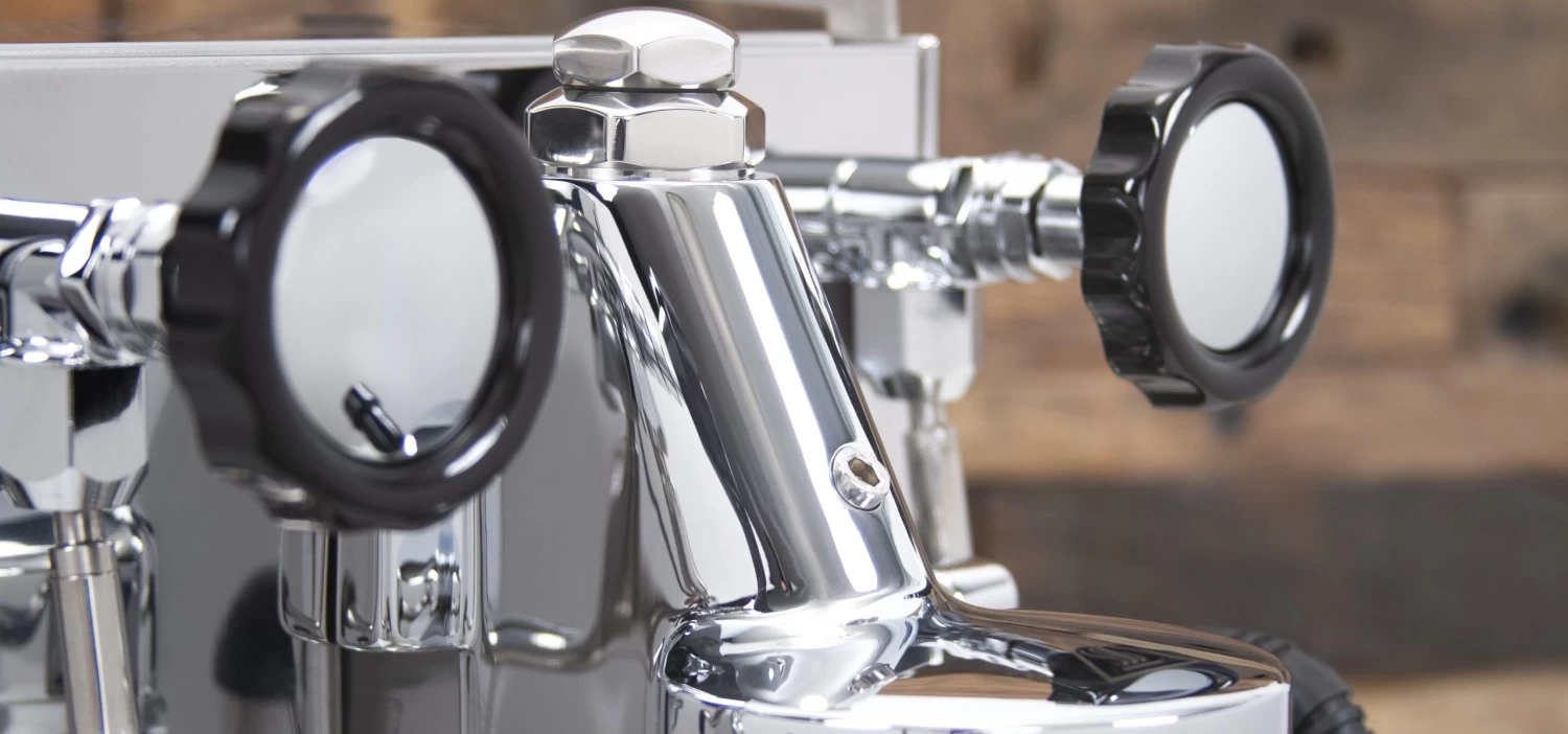 Wrapping the outside is a gorgeous, polished stainless steel housing, easily removed for work or maintenance. On top, you’ll find a large cup tray, fitted with soft foam padding to prevent rattling during operation. Rubber grips at the edges of the tray let you remove the tray comfortably and without hassle. The front of the machine is simple to read, keeping only the essential LEDs, favoring instead a single white LED above the power switch. A black double gauge presents both the steam and brew pressure for quick reference during operation. The iconic E61 group, equipped with a larger group nut, fits commercial standard 58 mm portafilters.