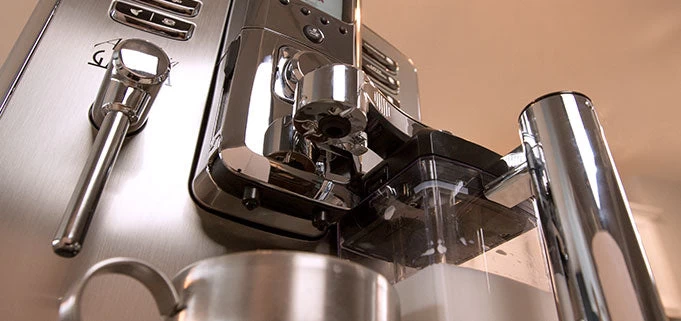The Accademia impressed us with its detachable milk carafe, which snaps into place, frothing up delicious bevvies on demand and automatically rinsing afterward. One thing to keep in mind with the Accademia, it doesn’t get milk straight from the refrigerator quite as hot as some other machines. It’s within the temperature sweet spot, but, if you like your milk on the hotter side, you can always steam with the wand, or take a look at the Gaggia Velasca Prestige or Gaggia Babilia for hotter automatic steaming machines. Back to the Accademia, it’s a smart machine, alerting you to any maintenance needs along the way, and descaling all on its own. We think the Gaggia Accademia is a modern, attractive machine that would look great in any kitchen. It features a contemporary stainless steel front panel punctuated by a bright display and intuitive push-button controls. With its large capacities, varied drink offerings and reliable design, the Accademia is the ideal companion for the coffee loving family or office.