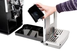 The Anima has an ample 24oz drip tray that collects water from inside of the machine as well as rinse water from the spouts and other external sources. The internal dreg box can hold up to 15 pucks of spent coffee before needing to be emptied.