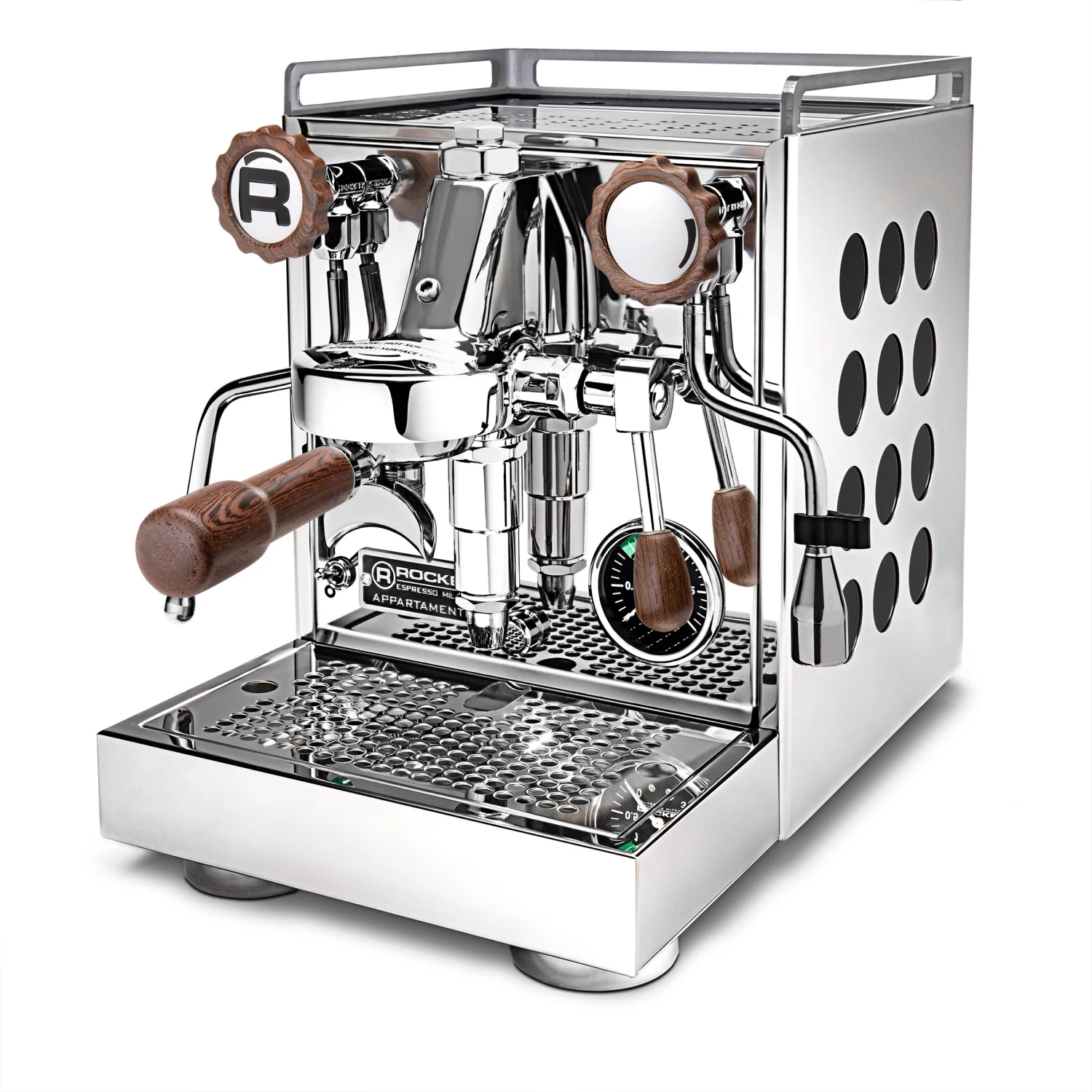 As a heat exchanger, the Appartamento can brew and steam at the same time, so there isn’t any downtime between brewing and steaming or multiple milk-based drinks. An E61 group head keeps the brew water temperature stable, by syphoning water from the boiler, through the group, and back, to ensure a consistent temp throughout. Rocket redesigned their E61 to incorporate a dual pre-infusion system, which consists of a static pre-infusion chamber and a mechanical element that has a progressively working piston, resulting in aromatic, crema-rich extractions. This machine is beauty and brains wrapped up into one.