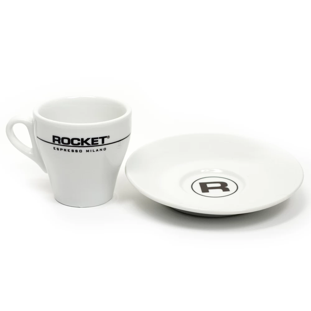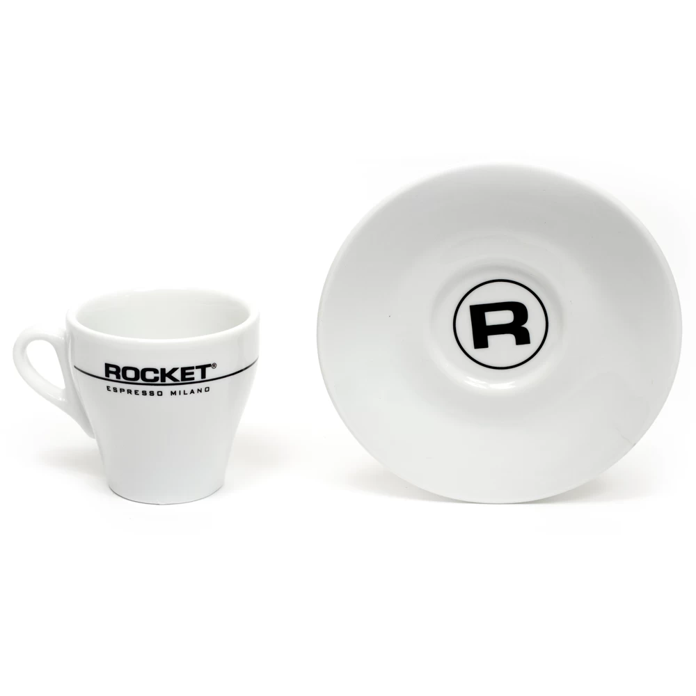 For those looking to complete their Rocket Espresso home cafe, this pair of striking porcelain espresso cups flaunts a flat white look and holds up to 4 fluid ounces and features the proud Rocket logo on the side.