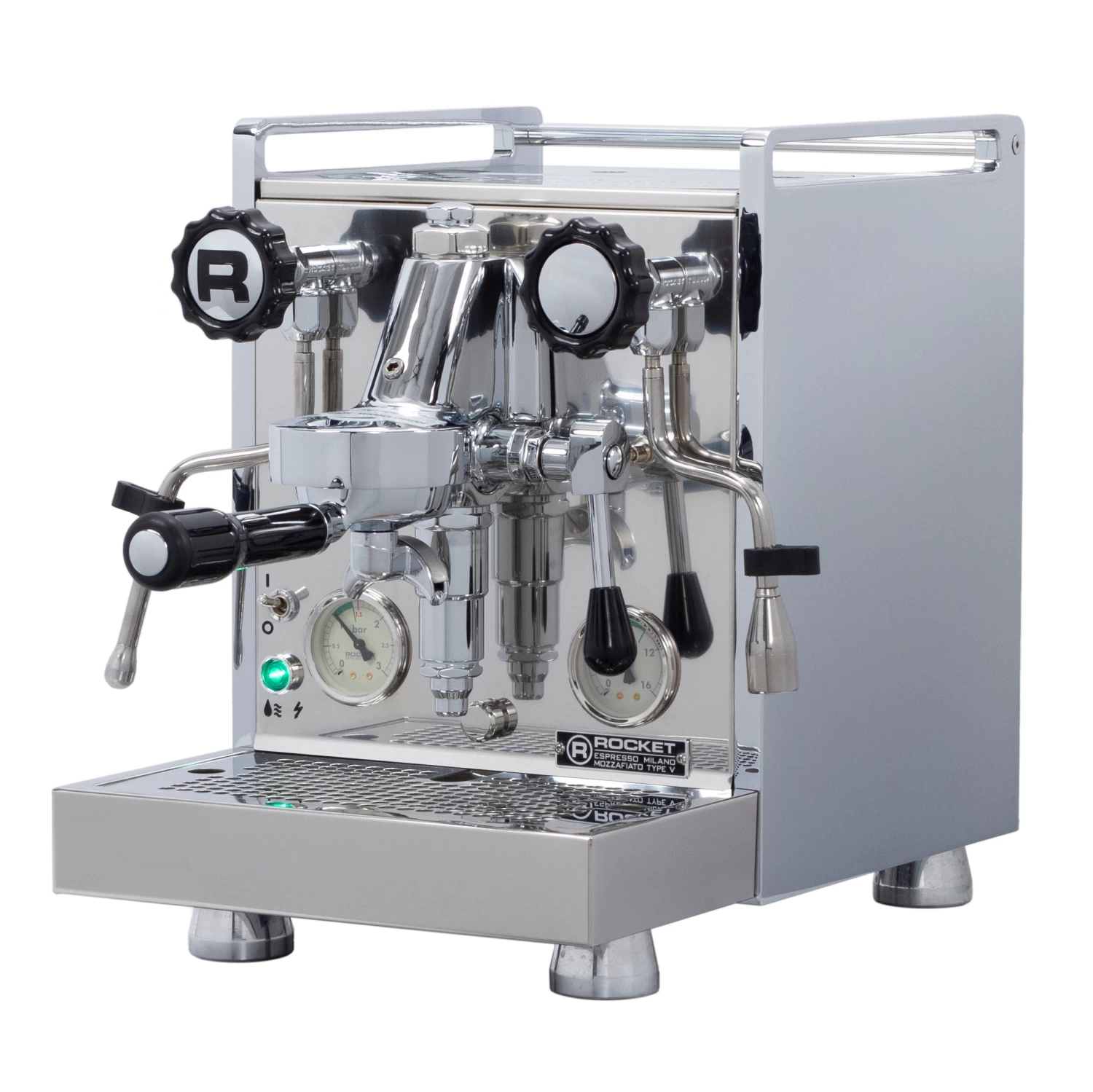 Rocket has incorporated all of its great aesthetic elements, such as the tapered, height adjustable feet, and easy-grip gear steam and hot water knobs with the iconic “R” stamped on the steam side. Rocket Espresso’s patented cool-touch technology ensures that the steam wand is safe to use, since only the nozzle gets hot. As a heat exchange machine, the Mozzafiato can brew and steam simultaneously, and, its integrated PID controller keeps the temperature stable and can be programmed across four settings to accommodate any roast.