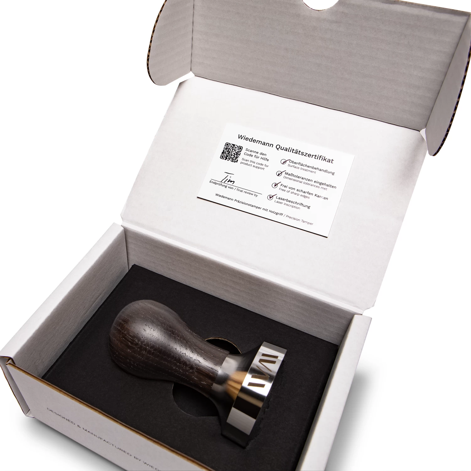 The ultimate blend of style, comfort and performance, the Wiedemann Precision 58.5mm Tamper in Blackened Oak takes all variables into account when it comes to form and function for espresso tamping. With its robust 58.5mm stainless steel base it eliminates play for level tamping and prevents loose coffee from adhering to the sides of the portafilter basket. The soft contoured wood of the handle is comfortable to hold and seamlessly joins with the base to naturally guide your thumb into proper tamping position.